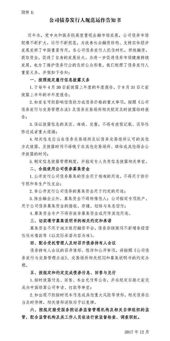 《通知》要求,各公司債券發(fā)行人應(yīng)通過公司官網(wǎng)、微信公眾號(hào)上掛《公司債券發(fā)行人規(guī)范運(yùn)作告知書》。
