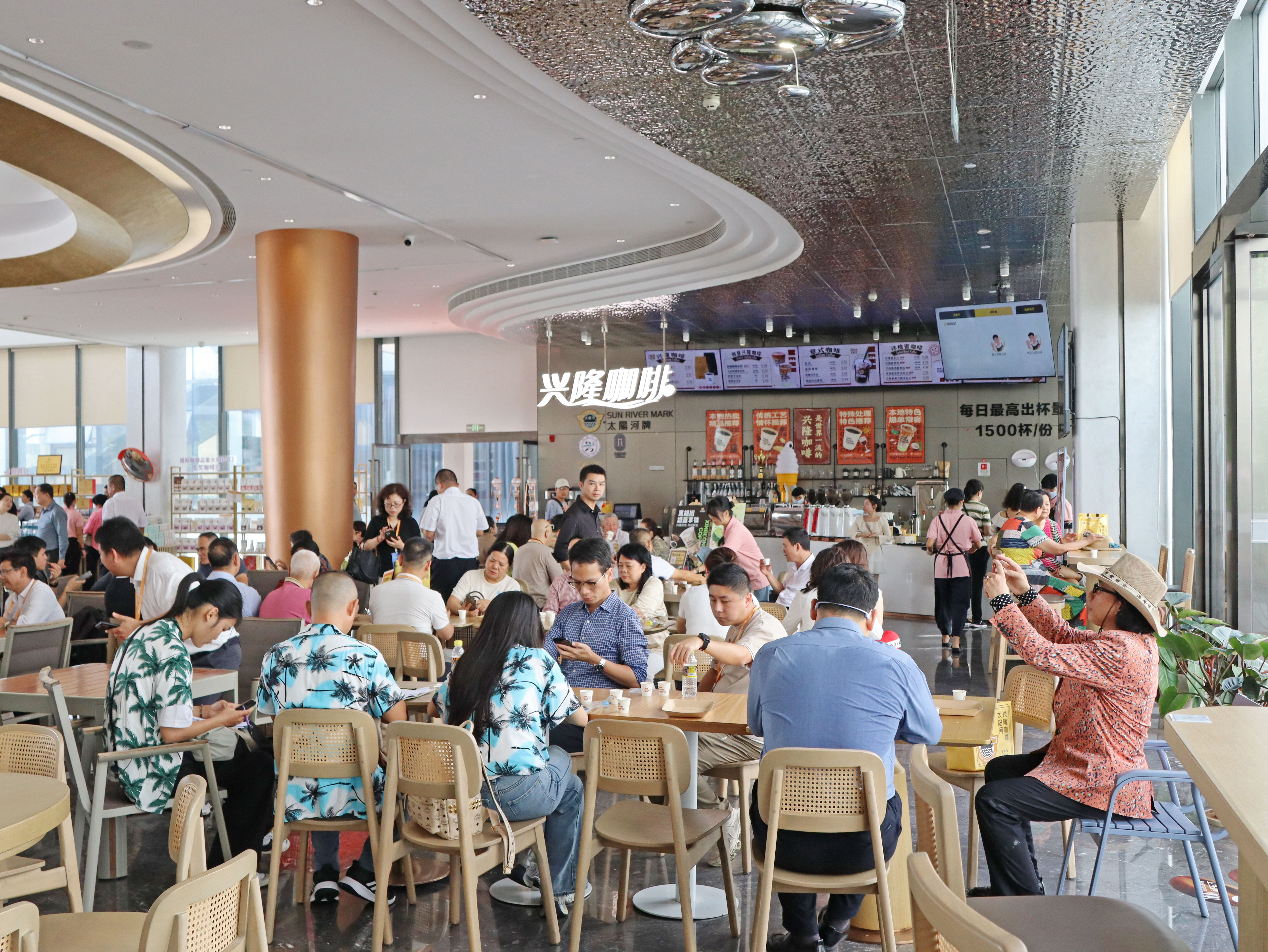▲代表團一行在正大?興隆咖啡文化園品鑒興隆炭燒咖啡。